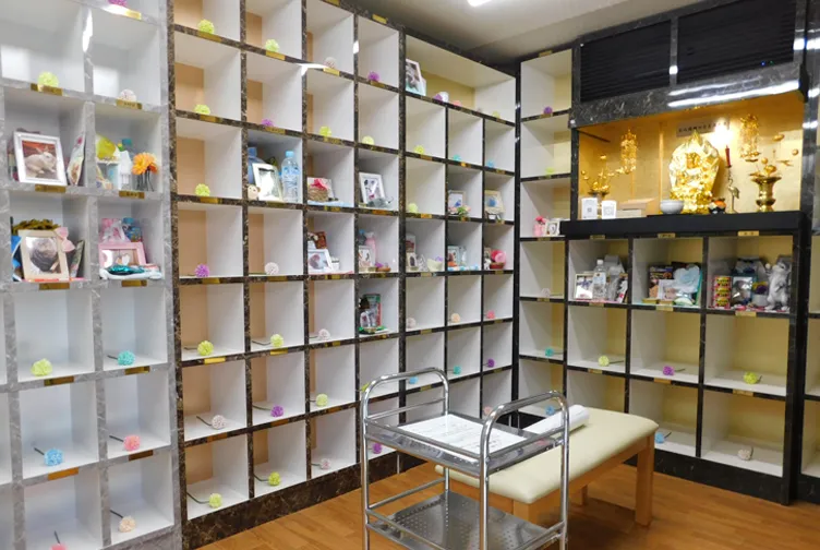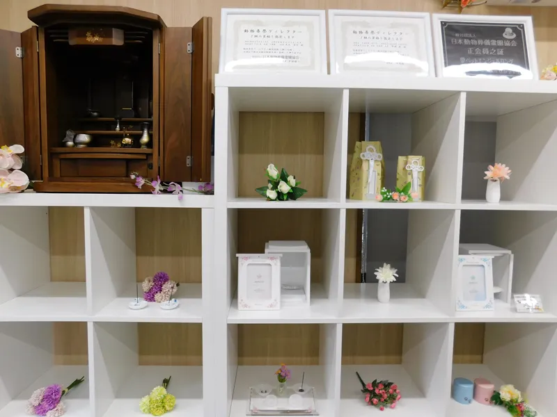 大切なペットをいつまでも身近に感じていただけるよう、写真立てやメモリアルグッズなどを取りそろえたショップを併設。供養の後も、想いを形に残すお手伝いをしています。